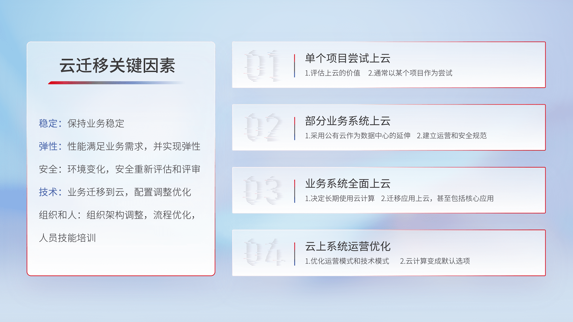 结合实际业务,,,,从规划设计、、、、云平台选型、、、、云原生改造、、、数据迁移、、集成交付,,迁移全过程为客户识别最佳上云路径,,,做好风险识别管理,,,,设计网络架构、、、、身份权限、、、、安全审计合规、、、、操作审计、、日志审计、、、、监控告警策略、、、、多站点容灾设计等,,对云上基础设施进行整体规划,,,提升IT治理水平,,,,以满足弹性、、高可用、、、高性能的需求。。
