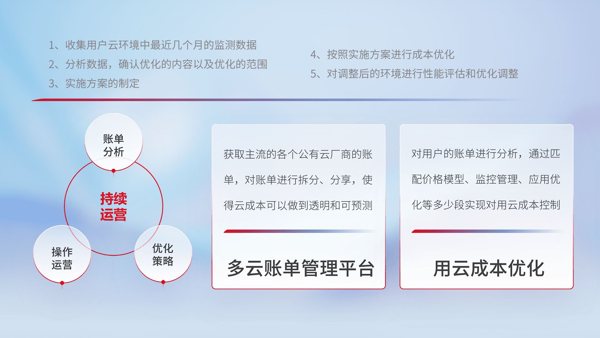 通过多云纳管,,以统一的资源数据模型把客户的云资源进行抽象和封装,,,,进而实现对多云资源的统一操作,,保障云资源管理的可靠性、、稳定性与可用性。。。。量身定制化运维内容,,,,配置、、、、开发运维、、、、补丁管理、、、、备份、、、、监控、、认证和访问管理、、、、审计和日常巡检等,,保障在用云过程中的可靠度,,,稳定度以及高可用率。。