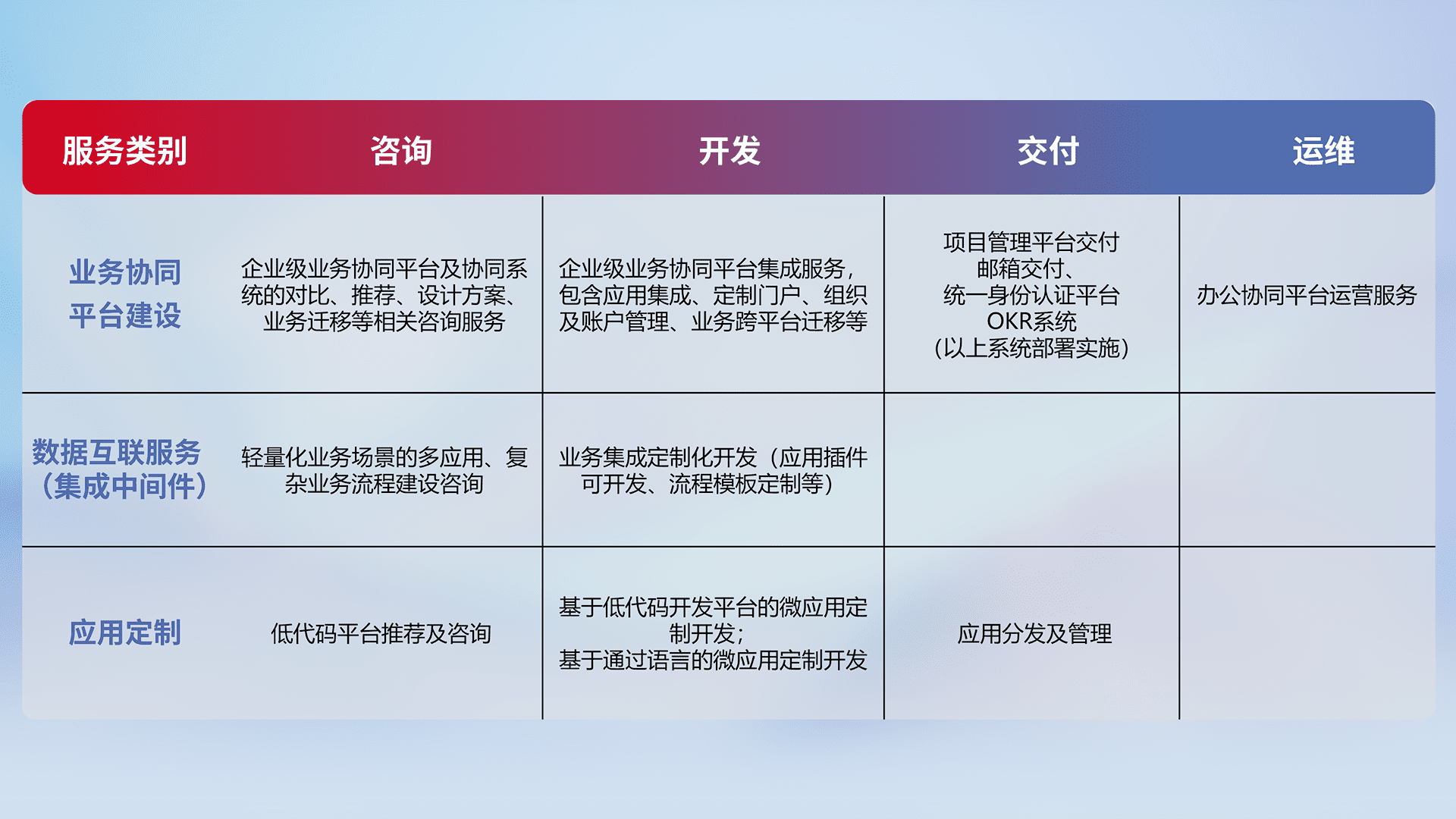 针对钉钉、、、企微、、、IDaas等平台级产品提供产品的规划、、、方案、、交付、、、定制化开发等服务,,,,实现如统一协同办公、、智能客户服务、、、混合会议管理、、智能数据查询、、、等业务场景,,实现数字化转型。。